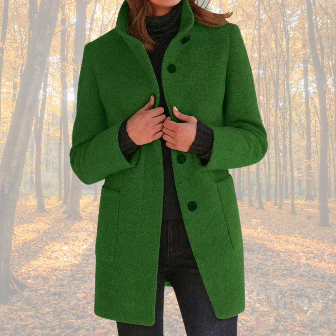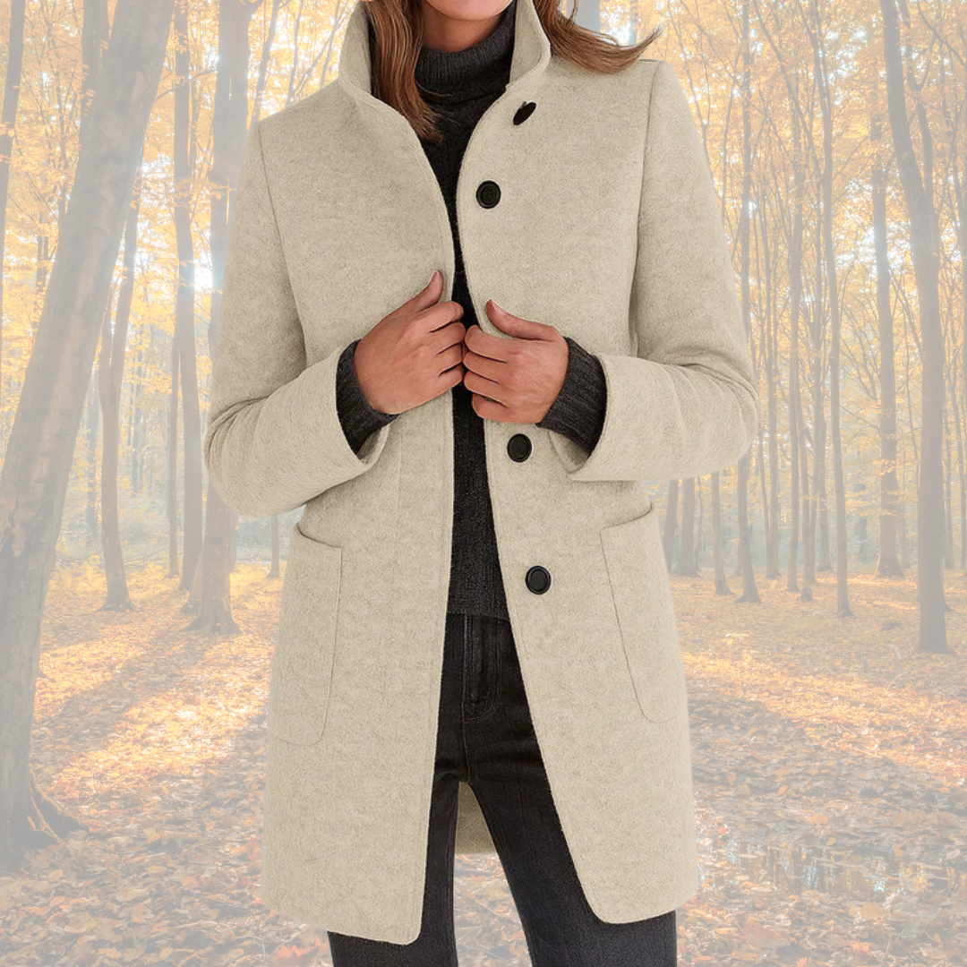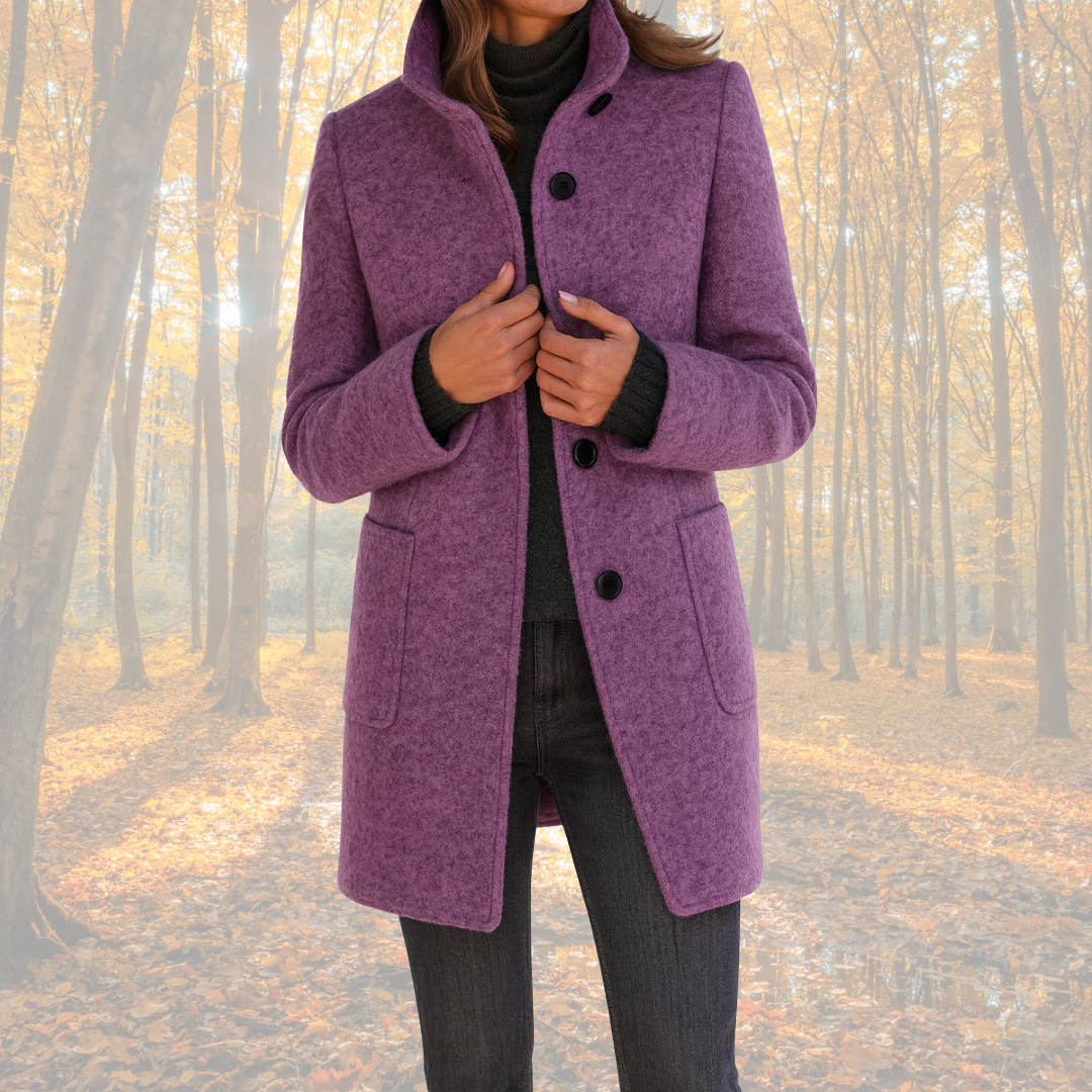 Wykonany z miękkiego, ciepłego materiału o strukturze wełny, doskonale chroni przed chłodem, nie tracąc przy tym swojej lekkości i elegancji. Klasyczny krój z guzikami i praktycznymi kieszeniami nadaje mu ponadczasowego szyku, a podwyższony kołnierz subtelnie wysmukla szyję.