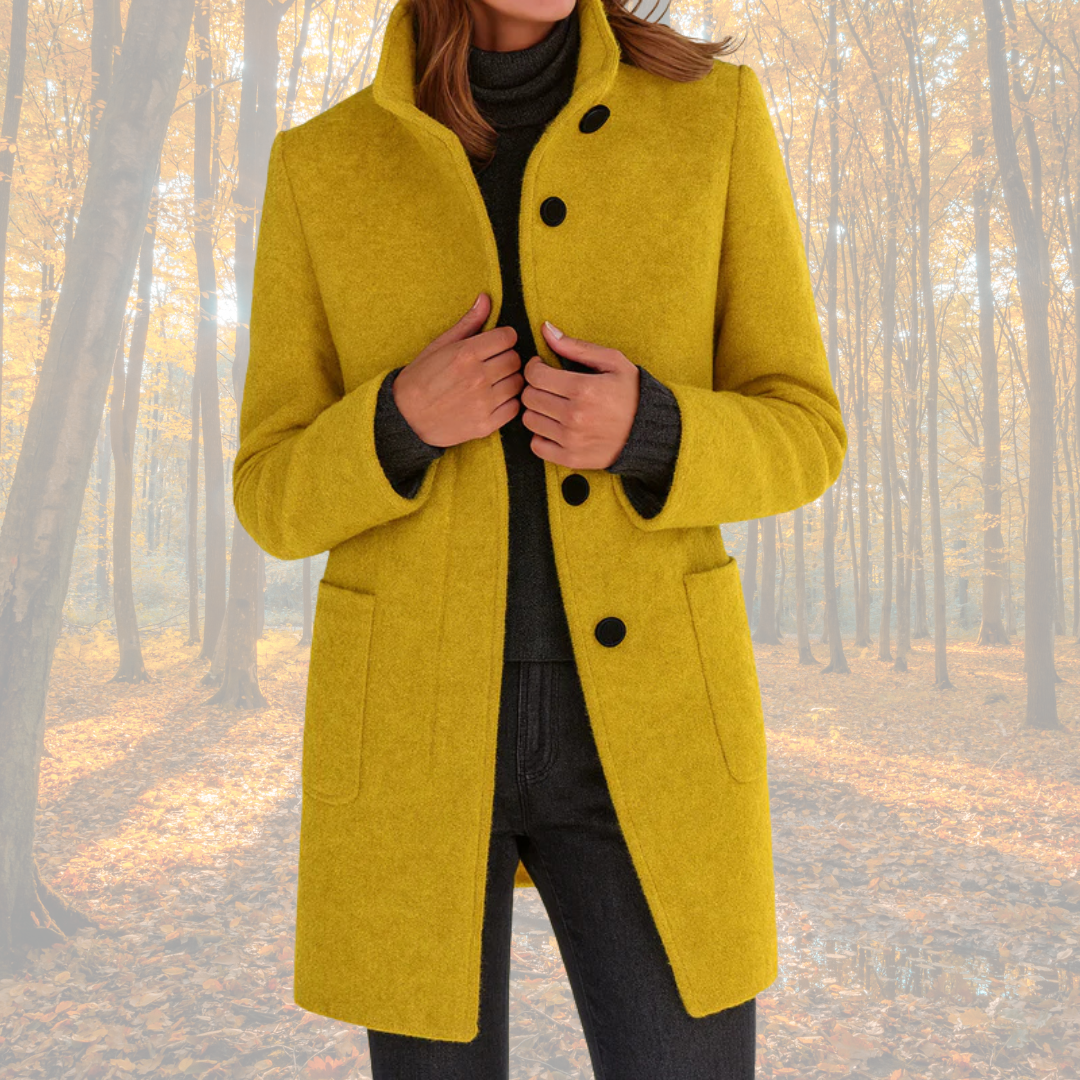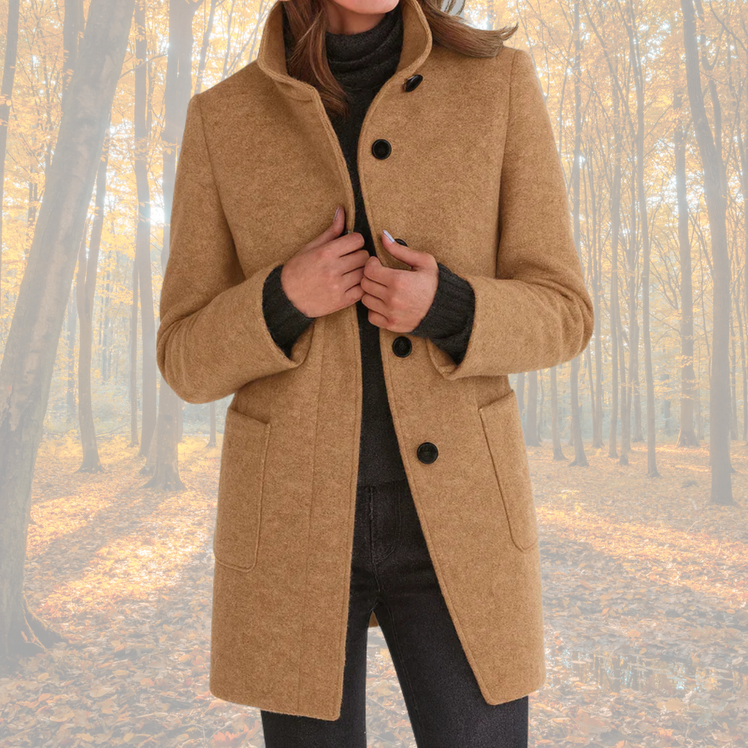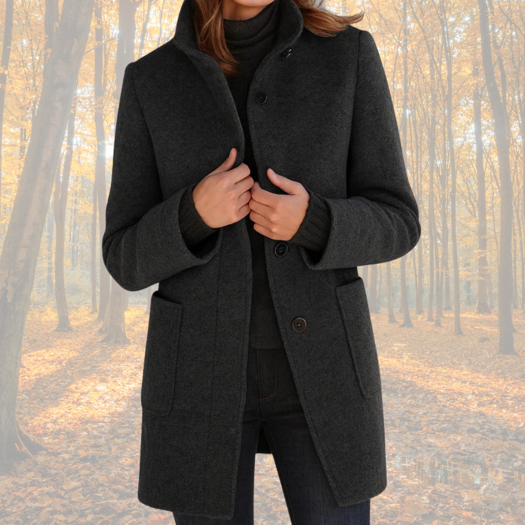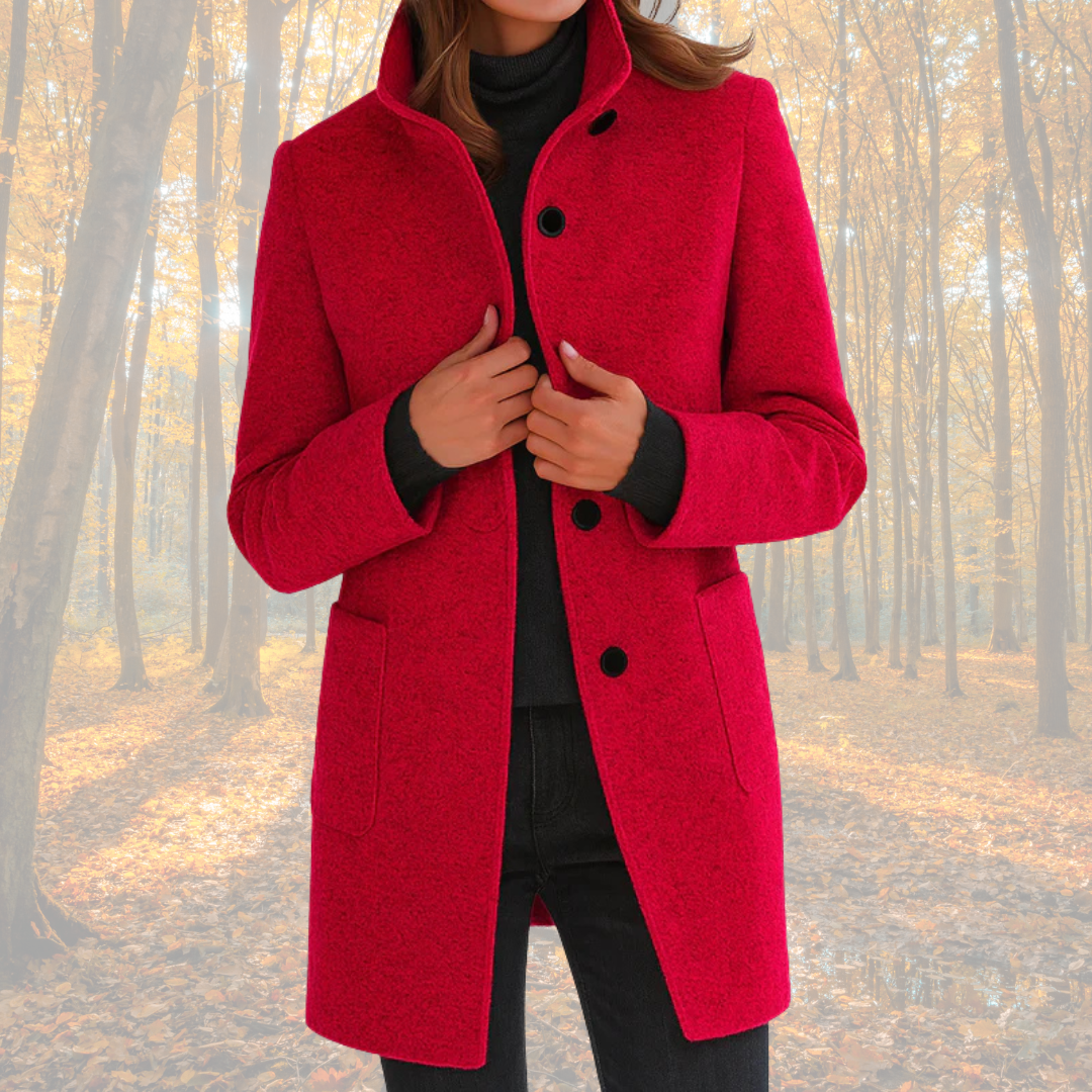 Wykonany z miękkiego, ciepłego materiału o strukturze wełny, doskonale chroni przed chłodem, nie tracąc przy tym swojej lekkości i elegancji. Klasyczny krój z guzikami i praktycznymi kieszeniami nadaje mu ponadczasowego szyku, a podwyższony kołnierz subtelnie wysmukla szyję.